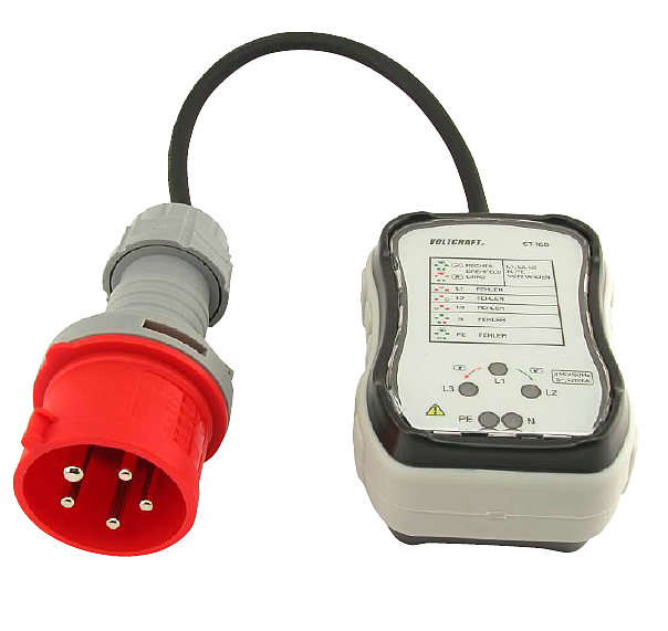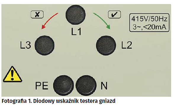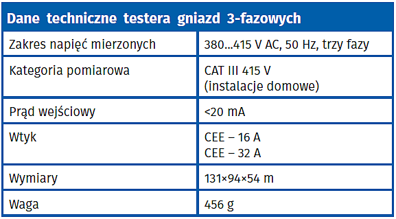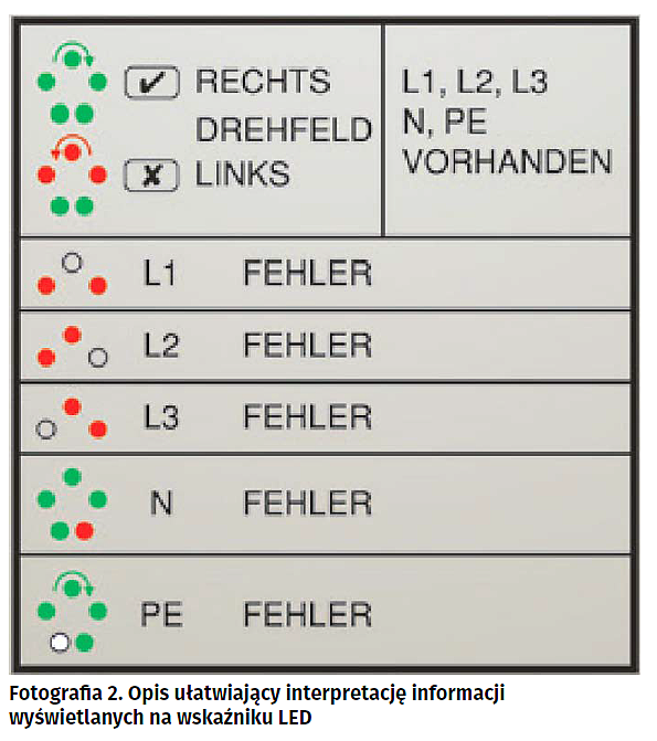 Tester składa się z dwóch elementów: poręcznej, można wręcz uznać, że kieszonkowej obudowy oraz wtyku 3-fazowego połączonego z testerem przewodem spełniającym odpowiednie warunki elektryczne. Na pulpicie testera umieszczono diody LED wyświetlające wyniki testów. Na podstawie wyświetlanych sekwencji użytkownik uzyskuje informację o konfiguracji i poprawności działania badanej sieci. Rozmieszczenie diod ułatwia interpretację przekazywanych komunikatów (fotografia 1). Diody są jedynymi elementami interfejsu użytkownika, gdyż testy nie dają żadnych wartości liczbowych. W przyrządzie nie ma więc żadnego wyświetlacza. Ze względu na to, że zapamiętanie znaczenia poszczególnych sekwencji mogłoby być trudne, na pulpicie umieszczono legendę opisującą znaczenie informacji wyświetlanych na LED-ach. Jest to tabela nadrukowana na pulpicie przyrządu (fotografia 2). Urządzenie jest oferowane wyłącznie w niemieckojęzycznej wersji opisów. Na szczęście słownictwo jest dość proste i nie powinno stanowić znaczącego utrudnienia dla użytkowników.