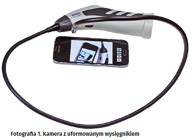 Zasada działania jest prosta. Miniaturową kamerkę mocuje się na końcu giętkiego wysięgnika, zachowującego jednak dostateczną sztywność, aby pamiętać kształt uformowany przez użytkownika (fotografia 1). Obraz jest przekazywany do dolnej części urządzenia, nazwijmy ją rękojeścią, za pośrednictwem przewodu wpuszczonego do wysięgnika. Zadaniem elektroniki znajdującej się w rękojeści jest obróbka danych z kamery i wyświetlenie jej na jakimś ekranie. Klasyczne kamery inspekcyjne miały w rękojeści montowany mały ekran, na którym można było oglądać obraz z kamery. Rozwiązanie takie, choć naturalne, było jednak trochę niewygodne. Kadrowanie obrazu wymagało manewrowania wysięgnikiem, jak wiemy, na sztywno mocowanym do rękojeści. W rezultacie zmienianie położenia kamerki wywoływało najczęściej zmianę ułożenie ekranu względem obserwatora. Nie była to wprawdzie wielka niedogodność, ale leniwy z natury człowiek zawsze szukał usprawnień. Problem rozwiązano za pomocą...