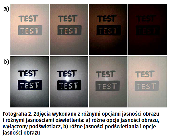 Fotografowie wiedzą doskonale, jak dużo zależy od oświetlenia. Problem ten rozwiązano w kamerze BS-20 w sposób klasyczny. Wokół miniaturowego obiektywu rozmieszczono 4 diody świecące na biało. Jasność świecenia jest regulowana potencjometrem umieszczonym w pistoletowej rękojeści kamery. Warto z niego korzystać, gdyż przy bliskich ujęciach może dochodzić do prześwietlania obrazu. Niezależnie od oświetlenia można także ustawiać programową jasność obrazu. Efekt końcowy zależy od optymalnego dla danego przypadku ustawienia obu parametrów. Kilka prób przedstawiono na fotografii 2. Jak widać na tych zdjęciach, istotnym problemem przy pracy z endoskopami jest odbijanie światła od obserwowanego obiektu. Niestety, w endoskopach z oczywistych powodów nie ma możliwości odsunięcia światła od osi obserwacji, stąd podatność na odbicia. Jedyną metodą minimalizacji tego efektu jest dobór odpowiedniej jasności oświetlacza.