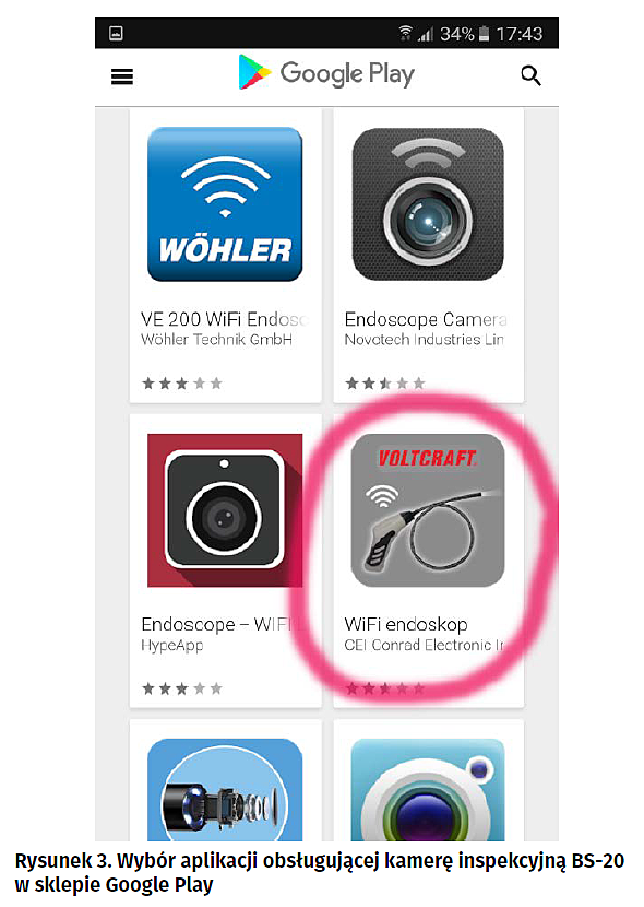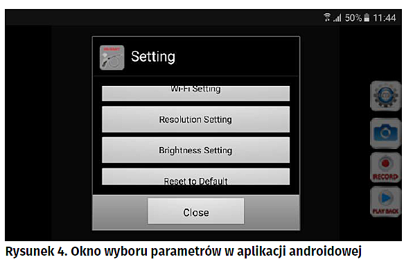 Do korzystania z kamery BS-20 konieczne jest zainstalowanie odpowiedniej aplikacji na swoim smartfonie lub tablecie. Pobiera się ją przez któryś z popularnych sklepów internetowych np. Google Play. Aplikacji należy szukać pod nazwą „Wifi endoskop”. Trzeba jednak zwrócić uwagę na wybór odpowiedniej pozycji, gdyż po zadaniu pytania wyszukiwarce pojawia się kilka odpowiedzi. Odpowiednia aplikacja ma dodatkowy opis „CEI Conrad Electronic International (HK) Limited (rysunek 3). Aplikacja jest darmowa, instaluje się bez problemów. Można jej używać na iPhone’ach, smartfonach oraz tabletach z systemem Android co najmniej 2.3.5 lub Apple iOS 4.1 albo nowszym. Po zainstalowaniu warto wejść w ustawienia (rysunek 4) i zmienić hasło. Można ewentualnie zmienić rozdzielczość i poeksperymentować z ustawieniami jasności obrazu.