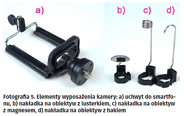Kamera jest dostarczana w małej plastikowej walizce, w której znajdują się dodatkowe elementy wyposażenia (fotografia 5). Są to: nakładka na obiektyw z lusterkiem, nakładka na obiektyw z magnesem, nakładka na obiektyw z hakiem, uchwyt na smartfon. Miniaturowe lusterko umożliwia oglądanie obrazu od tyłu. Wygięcie wysięgnika o 180o jest możliwe, ale zbyt duży minimalny promień gięcia praktycznie eliminuje tę metodę. Nasadki z magnesem i haczykiem umożliwiają natomiast podejmowanie niewielkich detali z trudno dostępnych miejsc, bez ich widoczności.