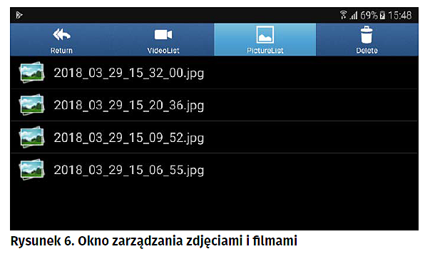 Zapisane zdjęcia i filmy są dostępne w aplikacji bez konieczności logowania się do sieci. Można je w niej oglądać i kasować (rysunek 6), ale edycja nie jest możliwa.