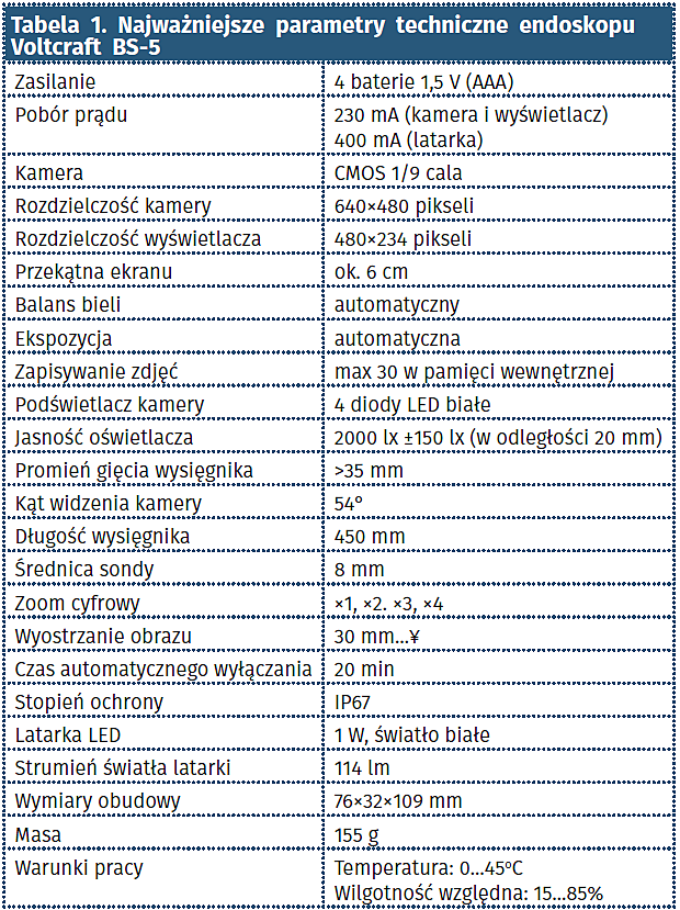 Miniaturowy endoskop Voltcraft BS-5 jest bardzo poręcznym, kieszonkowym urządzeniem przydatnym wtedy, gdy trzeba zajrzeć w słabo dostępne miejsca znajdujące się w zasięgu ręki lub nieznacznie większym. Dzięki małym wymiarom urządzenie może być łatwo przenoszone, do czego wykorzystywane jest materiałowe etui. Szkoda, że nie przewidziano w nim żadnego uchwytu umożliwiającego założenie kamerki na przykład na nadgarstek. Na uwagę zasługuje wysoki stopień ochrony IP67, co oznacza, że urządzenie jest odporne na kurz i krótkotrwałe zanurzenie w wodzie. Nie radzimy jednak prowadzenia podwodnych obserwacji kamerką.