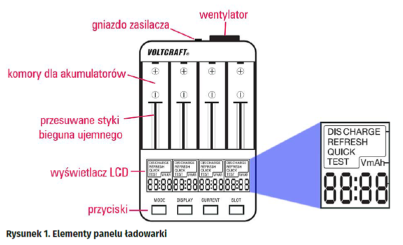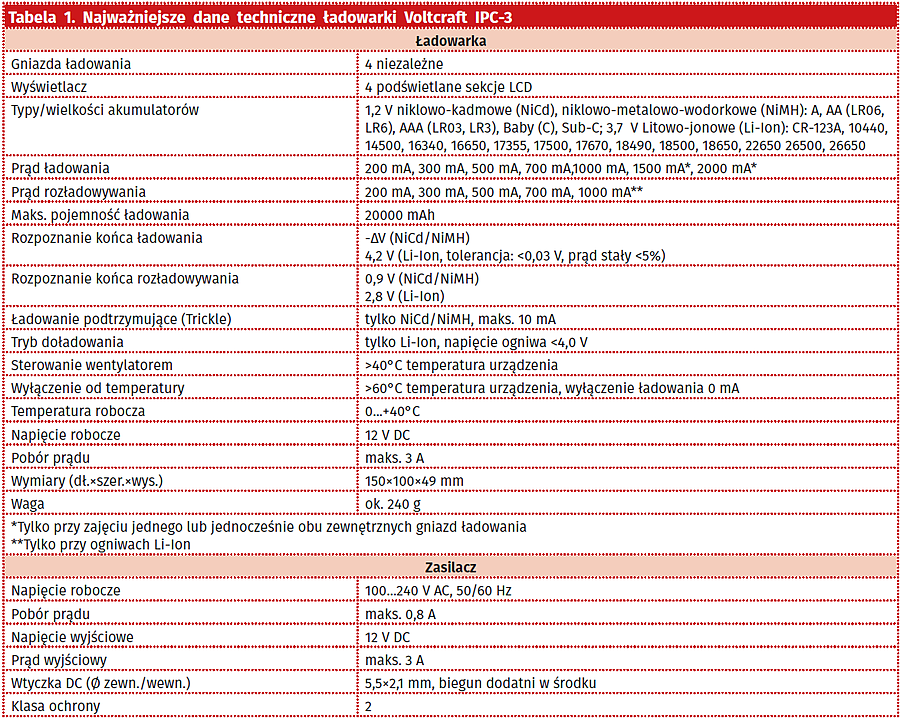 Ładowarka Voltcraft IPC-3 charakteryzuje się dobrym stosunkiem ceny do możliwości. Dane techniczne tego urządzenia zestawiono w tabeli 1. Przyjęte prądy ładowania i rozładowania pozwalają na w miarę szybkie ładowanie akumulatorów bez ich zbytniego nadwyrężania. Co najważniejsze, parametry te mogą być zmieniane przez użytkownika. Ważna jest również zdolność do ładowania akumulatorów różnych rozmiarów, nie tylko AA i AAA. Nie wiązałbym natomiast wielkich nadziei związanych z uruchamianiem programu „DISCHARGE REFRESH”, ale sam fakt, że jest możliwe jego uruchomienie być może poprawi samopoczucie niektórym właścicielom ładowarki IPC-3.