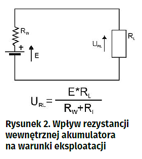 Z użytkowego punktu widzenia nie mniej ważnym parametrem jest rezystancja szeregowa ograniczająca maksymalny prąd pobierany z ogniwa. Wniosek z tego, że akumulator zachowujący nawet względnie dużą pojemność, ale charakteryzujący się dużą rezystancją wewnętrzną nie będzie się nadawał do zasilania urządzeń. Rezystancja wewnętrzna tworzy bowiem wraz z rezystancją obciążenia dzielnik napięciowy obniżający efektywne napięcie występujące na obciążeniu (rysunek 2), ogranicza też maksymalny prąd pobierany z akumulatora. Układy kontrolujące napięcie zasilania będą sygnalizowały rozładowanie akumulatora (niskie napięcie), mimo że zawiera on jeszcze sporo ładunku. Im większy będzie prąd pobierany z akumulatora, tym bardziej efekt ten będzie widoczny. Można przyjąć, że rezystancja wewnętrzna powyżej 500 mV świadczy o zużyciu akumulatora. Takie ogniwa mogą być eksploatowane jedynie w urządzeniach o małym poborze prądu. Jeśli urządzenie jest zasilane kilkoma ogniwami, należy pilnować, aby wszystkie miały zbliżoną rezystancję wewnętrzną. Duże różnice będą powodowały nierównomierne zużywanie ogniw i zmniejszenie wydajności zestawu.