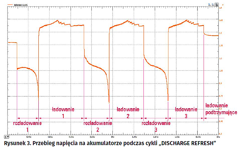Jak już było powiedziane pojemność akumulatorów zmniejsza się w trakcie użytkowania. Nadmierne obniżenie tego parametru świadczy o wyeksploatowaniu się akumulatora, co oznacza konieczność jego utylizacji. Przed podjęciem tej decyzji można jeszcze próbować nieco go ożywić. Wykorzystywany jest do tego celu program „DISCHARGE REFRESH”. Metoda regeneracji polega na wykonaniu 3 następujących po sobie cykli ładowania i rozładowywania. Po zakończeniu każdego cyklu wyświetlana jest zmierzona pojemność akumulatora. Praktyka wykazuje jednak, że opisana próba regeneracji ma ograniczoną skuteczność. Dalsze używanie akumulatorów i tak oznacza konieczność szybkiej ich wymiany. Na rysunku 3 przedstawiono przebieg napięcia na akumulatorze podczas cykli „DISCHARGE REFRESH”. Akumulator poddawany zabiegom renowacyjnym był wcześniej przez kilka lat eksploatowany w różnego rodzaju urządzeniach. Jego pojemność znamionową producent określił na 600 mAh. Aktualna pojemność zmierzona przez ładowarkę po wykonaniu 3 cykli odświeżających była równa 469 mAh, ale rezystancja wewnętrzna wzrosła do 418 mV.