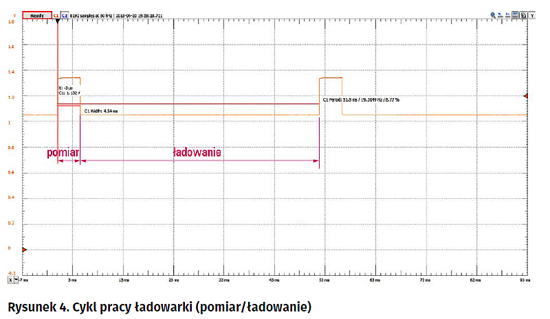 Procesor nie jest oczywiście w stanie zmierzyć siły elektromotorycznej obciążonego akumulatora, gdyż widzi go jedynie od strony jego końcówek. Jak już było powiedziane wcześniej, napięcie mierzone na tych końcówkach jest zmniejszone w stopniu zależnym od stosunku rezystancji wewnętrznej akumulatora do rezystancji obciążenia. Aby zmierzyć siłę elektromotoryczną należy na chwilę odłączyć obciążenie. Algorytmy zaimplementowane w oprogramowaniu procesora ładowarki IPC-3 uwzględniają taką operację i w celu pomiaru siły elektromotorycznej odłączają ładujące źródło prądowe (w trybach ładowania) lub obciążenie (w trybach rozładowania). Czasy pomiarów zależą nieco od prądu. Dla 500 mA pomiar trwa ok. 18 m i jest powtarzany co ok. 52 ms (rysunek 4).