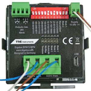 Na tylnej ścianie wskaźnika umieszczono przełączniki typu dip-switch oraz wyprowadzenia szpilkowe dla zworek, za pomocą których przełączane są tryby pracy i zakresy pomiarowe. Są tu też gniazda śrubowe służące do dołączenia zasilania oraz mierzonych sygnałów (fotografia 1). Uwagę zwracają jeszcze dwa gniazda. Za pośrednictwem pierwszego z nich (śrubowego) wyprowadzane są dwa sygnały sterujące generowane przez wbudowaną logikę. Są to izolowane galwanicznie wyjścia transoptorowe wykorzystywane do sterowania zewnętrznymi układami wykonawczymi systemu automatyki, w którym zastosowano miernik DPM72-MPN. Transoptor nie nadaje się do załączania urządzeń wysokonapięciowych lub wysokoprądowych, służy więc jedynie jako ogniwo pośrednie sterujące odpowiednim przekaźnikiem lub stycznikiem.