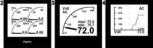 Miernik DPM72-MPN ma wprawdzie tylko jeden wyświetlacz, lecz mogą być na nim umieszczane aż 4 wirtualne wskaźniki i to różnego rodzaju (fotografia 2). Bardzo przydatna jest możliwość ustawiania własnych wartości maksymalnych na skalach mierników. Dwa kanały pomiarowe - napięciowy i prądowy - umożliwiają natomiast realizację miernika mocy. Wykorzystując powyższe cechy łatwo można zbudować np. zintegrowany miernik wskazujący napięcie, prąd, moc i częstotliwość. Ale funkcje miernika nie muszą być przypisane na stałe. Łącząc zworki np. z przełącznikiem o odpowiedniej konstrukcji umieszczonym również na panelu możliwe staje się przełączanie nim trybów pracy przyrządu. Niestety, nie można tą metodą zmieniać zakresów pomiarowych. Pewnym rozwiązaniem jest założenie zworki J3, włączającej autoskalowanie.
