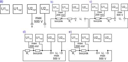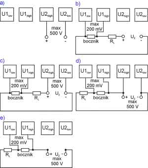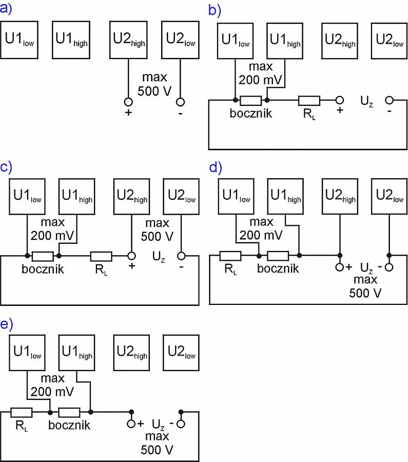Sygnały mierzone są doprowadzane do dwóch par złączy śrubowych oznaczonych U1high i U1low oraz U2high i U2low. Jak widać, oba mają oznaczenie „U”, co mogłoby sugerować, że są to złącza napięciowe, a wiemy przecież, że jedna z tych par jest wykorzystywana do pomiaru prądu. Nie ma w tym nic dziwnego, gdyż natężenie prądu jest określane na podstawie pomiaru napięcia na boczniku. Możliwe stają się zatem konfiguracje połączeń przedstawione na rysunku 6a...e. UZ to napięcie zasilające odbiornik RL, które może być mierzone bezpośrednio, np. w celu obliczenia mocy. Istnieją dwie konfiguracje połączeń: od strony niskiej (rysunek 6b i c) oraz od strony wysokiej (rysunek 6d i e). Połączenie od strony wysokiej jest dopuszczalne tylko wtedy, gdy napięcie mierzone jest nie większe niż 50 V.