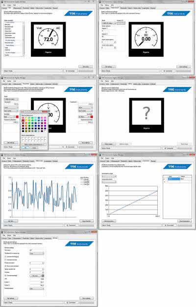 W zakładce „Measurement” ustawiane są rodzaje pomiarów: napięcie, prąd, moc, częstotliwość, a także związane z tymi parametrami opisy skali. Zakładka „Thresholds” umożliwia z kolei zadawanie wartości progowych z ewentualnym uwzględnianiem histerezy, i wybieranie typu reakcji na sytuacje alarmowe.