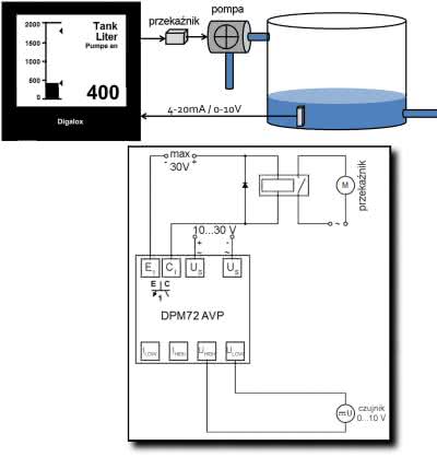 Wykorzystując cechy mierników panelowych rodziny Digalox użytkownicy mogą konstruować proste systemy sterowania bez konieczności stosowania znacznie droższych rozwiązań ze specjalizowanymi sterownikami PLC. Producent na swojej stronie internetowej przedstawia dwie przykładowe aplikacje. Jedna z nich jest wykorzystywana do sterowania pompą napełniającą zbiornik.