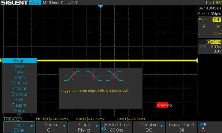 W trybie Auto jeśli warunki wyzwalania nie zostaną spełnione, oscyloskop i tak dokona akwizycji byle coś pokazać na ekranie. W trybie Normal akwizycja nastąpi za każdym razem, gdy warunki wyzwalania zostaną spełnione, ale tylko wtedy. Tryb Single oczywiście dokona pojedynczej akwizycji, gdy warunki zostaną spełnione, po czym wyświetli wynik na ekranie. W przeciwieństwie do DS1054Z Rigola Siglent zdecydował się udostępnić wszystkie typy wyzwalania w cenie produktu, co było jednym z powodów, dla którego wybrałem właśnie ich oscyloskop. Menu wyboru typów wyzwalania (rysunek 1) oferuje od razu podpowiedź wyjaśniającą ich działanie.