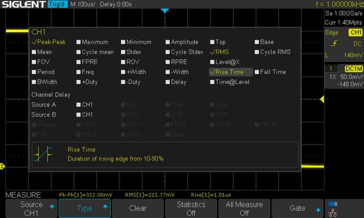 Na rysunku 4 został pokazany przykład pomiaru amplitudy (pk-pk i RMS) oraz czasu narastania sygnału prostokątnego. W praktyce jednak ich przydatność bywa różna. Większość pomiarów dotyczy pojedynczego kanału, ale jest grupa dziesięciu, które porównują dwa kanały ze sobą.