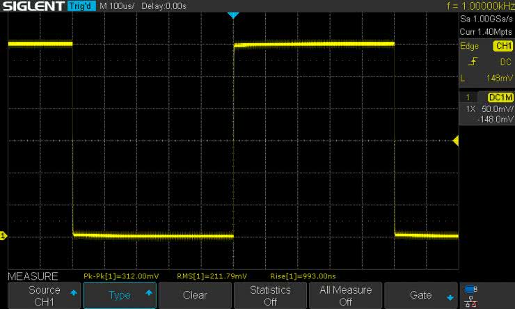 Każdy kanał ma też własny ogranicznik pasma do 20 MHz. Minimalne pasmo przenoszenia przy sprzężeniu AC jest poniżej 2 Hz. Pod względem zniekształceń wzmocnienia Siglent SDS1104X-U może się pochwalić liniowością tegoż na poziomie poniżej ±1 dB do 10 MHz, poniżej ±2 dB dla zakresu 10...50 MHz, oraz około +2 dB od 50 MHz do 100 MHz. W testach różnych użytkowników pasmo –3 dB sięga często powyżej 120 MHz, ale to mocno zależy od egzemplarza – Siglent gwarantuje pasmo do 100 MHz. W praktyce amatorskiej nieczęsto zdarza się pracować przy tak wysokich częstotliwościach – mi w ostatniej dekadzie zdarzyło się to tylko dwa razy.