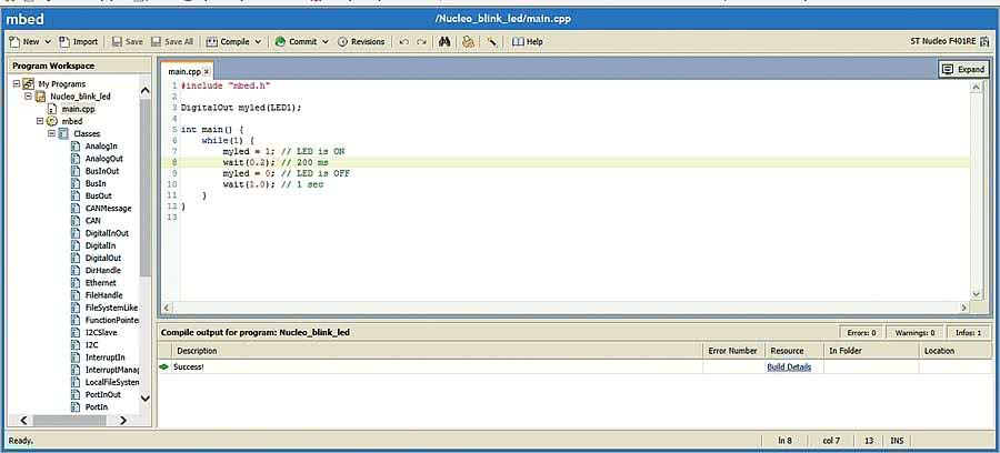 Wspomnianym atutem płytek Nucelo jest ich zgodność z internetowym pakietem narzędziowym mbed (www.mbed.org - rysunek 6), dla którego są one natywnymi platformami sprzętowymi (rysunek 7). Nie oznacza to jednak, że konstruktorzy przyzwyczajeni do innych środowisk będą musieli zmienić swoje przyzwyczajenia: wbudowany w zestawy programator jest zgodny z popularnym ST-Link/v2, dzięki czemu testowany mikrokontroler można programować z poziomu wszystkich popularnych pakietów narzędziowych, jak na przykład: Keil MDK (mVision), IAR EWARM (Workbench), czy Atollic TrueStudio.