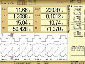 Przykładowe wyniki pomiarów z zastosowaniem η formuł przedstawiono na rysunku 3. Badano tu turystyczną przetwornicę napięcia stałego 12 V na napięcie zmienne 230 V o nominalnej mocy wyjściowej 200 W. Przetwornice obciążono świetlówką o mocy 10 W. W polu η1 umieszczono formułę zdefiniowaną według wcześniejszego opisu. Moc P1 mierzono elementem 1 po stronie DC, natomiast moc P2 mierzono elementem 2 po stronie AC. Jak widać, w takich warunkach przetwornica osiąga sprawność ok. 71%. Niestety obserwujemy również jak dalece napięcie wyjściowe odbiega od sinusoidy.