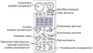 Łatwo dostrzec charakterystyczne dla oscyloskopów pokrętła: podstawy czasu, czułości kanałów pomiarowych, przesuwu oscylogramów. Są też elementy uaktywniające obliczenia matematyczne, pomiary automatyczne i kursorowe, a także przełączniki wyboru trybów wyzwalania, akwizycji itp. Uzupełniają je elementy konfigurujące pomiary mocy i klawiatura numeryczna.