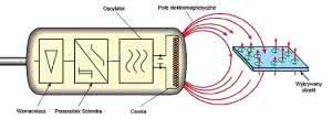 Jak wspomniano, kluczowym elementem czujnika indukcyjnego jest cewka umieszczona przy czole obudowy. Rdzeń cewki jest otwarty od strony czoła, a ponieważ jest ona włączona w obwód oscylatora, zbliżenie elementu metalowego do czujnika powoduje zmianę amplitudy oscylacji. W klasycznych rozwiązaniach, po demodulacji, sygnał z oscylatora jest kierowany na przerzutnik Schmitta.