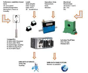 Biorąc pod uwagę wymagania zawarte w normach oraz dane potrzebne do walidacji projektu analitycznego, do budowy systemu wykorzystano platformę CompactRIO. Na turbinie Kliux GEO4K (o pionowej osi obrotu) oraz przyległych urządzeniach, w celu zebrania potrzebnych informacji, zamontowano sieć rozproszonych czujników.