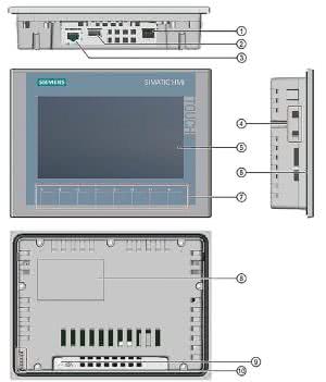 Najważniejszymi elementami z punktu widzenia użytkownika dotykowy ekran oraz cztery przyciski funkcyjne. Na rysunku 2 przedstawiono złącza dostępne w panelu. Wraz z urządzeniem dostarczane są uchwyty do montażu panelu w szafie sterowniczej oraz wtyczkę do podłączenia zasilania.