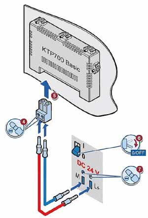 Panele są zasilane napięciem stałym o wartości 24 VDC. Należy o tym pamiętać, aby nie uszkodzić urządzenia. Sposób dołączenia zasilania do panelu pokazano na rysunku 3. Zgodnie z normą, do wykonania połączenia należy wykorzystać przewody o przekroju 1,5 mm² w kolorze niebieskim i czerwonym.