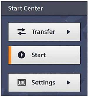 Po włączeniu zasilania panel zacznie się uruchamia, co trwa to około 1 minuty. W tym czasie jest uruchamiany program Start Center. Widok obrazu wyświetlanego przez Start Center pokazano na rysunku 4. Jeżeli panel jest nowy (w pamięci urządzenia nie znajduje się żaden projekt), to przycisk Start będzie nieaktywny. Dostępne przyciski wykonują następujące czynności: