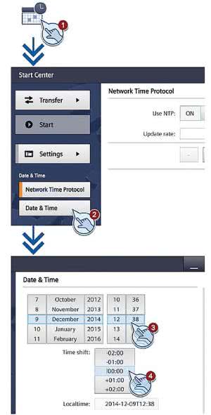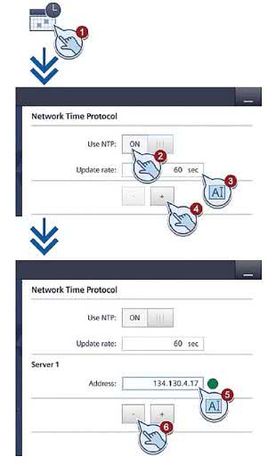 Należy określić maksymalnie cztery różne serwery czasu, aby pobrać czas dla panela operatorskiego. Synchronizacja czasu będzie przeprowadzona poprzez "Network Time Protocol" (NTP). Dostępność serwera jest sprawdzana. Istnieje także opcje ustawienia częstotliwości synchronizacji czasu z serwerem. Sposób ustawienia daty i godziny z wykorzystaniem serwera NTP przedstawiono na rysunku 6. Aby ustawić godzinę i datę: