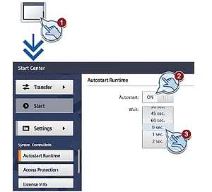 Okno dialogowe System Control/Info pozwala na ustawienie, jak szybko włączy się projekt po włączeniu zasilania dla panelu HMI (rysunek 9). Czas oczekiwania wpisuje się w polu Wait. Musi on zawierać się w przedziale 0...60 sekund.