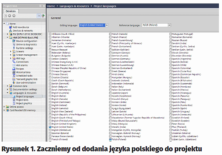 Zaczniemy od dodania języka polskiego do projektu. Przedstawia to rysunek 1. Z drzewa projektu przechodzimy do Languages & resources i następnie wybieramy Project languages. Domyślnie powinien być wybrany język angielski. Odszukujemy język polski i też go zaznaczamy. Przechodzimy teraz do Project text z Languages & resources, co przedstawia rysunek 2.
