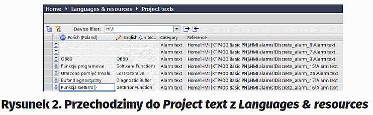 Na początku na samej górze w polu Device filter wybieramy HMI aby tylko były widoczne teksty z samego panelu dotykowego. Widzimy, że są dwie kolumny: Polish (Poland) oraz English (United States). Kolumna dla języka polskiego jest pusta. Należy przetłumaczyć każdy napis z języka angielskiego na polski. Można to zrobić ręcznie w tym miejscu, lub wyeksportować wszystkie napisy do pliku z rozszerzeniem „.xlsx”. W pasku narzędzi tego okna znajduje się ikona do eksportu oraz importu. Po wyeksportowaniu taki plik można przesłać do biura tłumaczeń.