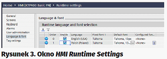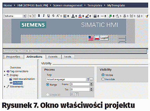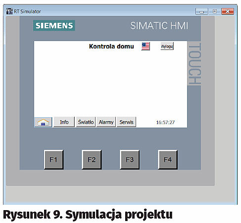 W ten sposób zostały zakończone przygotowania. Teraz należy projekt wgrać na panel lub uruchomić symulację, co przedstawia rysunek 9. Wizualizacja uruchomiła się w języku angielskim, ale została zmieniona na język polski. W tej chwili jest widoczny tylko przycisk z flagą USA, aby ponownie przejść na język angielski. Pewną trudnością podczas tworzenia wizualizacji jest właściwy dobór rozmiaru obiektów graficznych. Przykładem jest przycisk Wyloguj, którego rozmiar tekstu jest nieznacznie za duży. Należy na to zwracać uwagę.