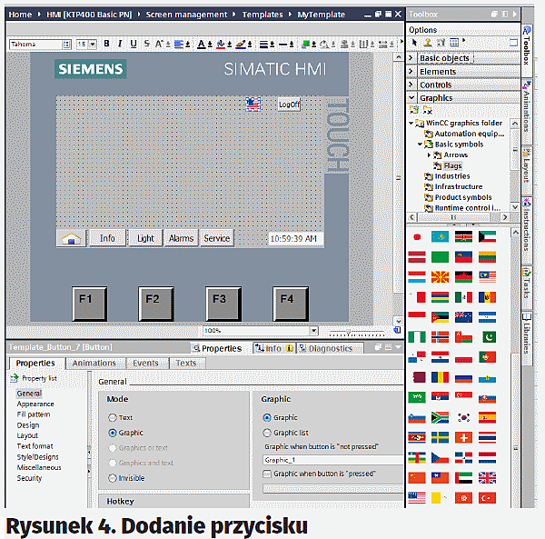 Obiekt został umieszczony na górze ekranu. Przycisk będzie zawierał flagę kraju, która odpowiada danemu językowi. Flagi możemy wybrać z zakładki Graphics dostępnej w karcie Toolbox z prawej strony TIA Portal. W pierwszej kolejności dla właściwości przycisku w polu Mode wybieramy Graphic. Następnie do pola Graphic przeciągamy myszką odpowiednią flagę. Zostanie jej przydzielona domyślna nazwa, która w tym przypadku to Graphic_1. W analogiczny sposób dodajemy kolejny przycisk i następnie należy wybrać flagę polski.