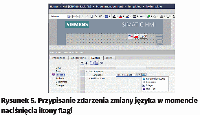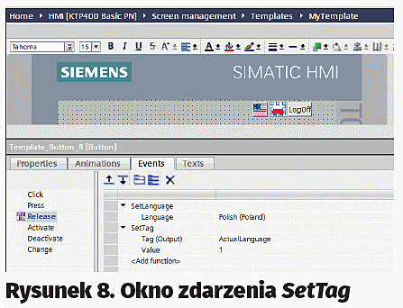 Ostatnia czynność do wykonania, to ustawianie wartości dla tagu ActualLanguage. Wykorzystamy do tego celu zdarzenie SetTag co przedstawia rysunek 8. Na liście pojawia się drugie zdarzenie o nazwie SetTag, które jest powiązane z tagiem ActualLanguage. W tym przypadku po naciśnięciu przycisku z flagą Polski nastąpi przypisanie do tagu ActualLanguage wartości 1. Analogicznie konfigurujemy przycisk z flagą USA. Jedyna różnica, to po naciśnięciu tego przycisku powinno nastąpić przypisanie dla tagu ActualLanguage wartości 0.
