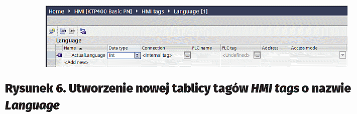 Zostanie dodana jeszcze jedna funkcjonalność. W danej chwili będzie widoczny tylko jeden przycisk z językiem, na który może nastąpić przełączenia. Dla przykładu, jeżeli na panelu HMI są wyświetlane napisy w języku angielskim, to powinien być widoczny tylko przycisk z flagą polski. Do zrealizowania tego zadania należy utworzyć nową tablice tagów HMI tags o nazwie Language. Zostało to przedstawione na rysunku 6. Utworzono tag o nazwie ActualLanguage typu Int. Jest to wewnętrzny tag wykorzystywany w obrębie panelu HMI. Domyślna wartość dla tego tagu to zero.