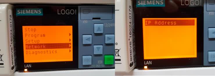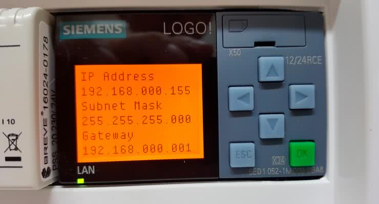 - Dołączamy LOGO! za pomocą kabla Ethernet do sieci lokalnej i ustanawiamy (np. z poziomu lokalnego menu LOGO!, wybierając kolejno Network>IP Address – fotografia 1) jego adres IP (na stałe, nie działa tu DHCP), maskę sieci i punkt dostępowy (w przykładzie są to: 192.168.0.155/255.255.255.000/192.168.0.1) – fotografia 2.
