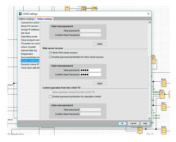 - Konieczne jest włączenie serwera HTTP, przy okazji czego można (w zasadzie: trzeba) ustalić własne hasło dostępowe. W tym celu wybieramy w menu programu LOGO! Soft Comfort opcję Tools>Transfer>Access Control (rysunek 3). W wyniku tej operacji wyświetla się okno Interface (rysunek 4), w którym podajemy (lub wybieramy z wcześniejszych wpisów książki adresowej) adres IP sterownika (Target IP Address) i klikamy OK. Jeżeli sterownik jest w trybie RUN pojawia się kolejne okno (rysunek 5) z propozycją przełączenia go w tryb Stop, co jest konieczne do wprowadzenia modyfikacji w konfiguracji sterownika. W kolejnym wyświetlonym oknie (rysunek 6) znajdujemy sekcję Web server access, w której zaznaczamy opcje Allow Web server access oraz Enable password protection for Web server access. W podsekcji Enter new password dwukrotnie wprowadzamy hasło zabezpieczające przed nieuprawnionym dostępem do zasobów serwera i zatwierdzamy konfigurację za pomocą przycisku Apply w sekcji. Po zatwierdzeniu zmian sterownik jest za zgodą użytkownika przełączany w tryb Run rozpoczynając normalną pracę.