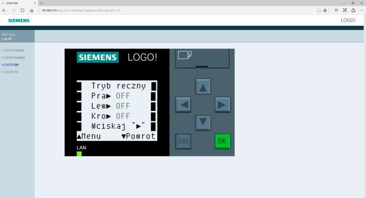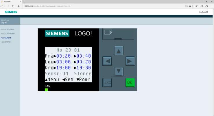 - LOGO! BM: umożliwia zdalne „oglądanie” treści wyświetlacza LOGO!, przy czym serwer udostępnia wyłącznie te ekrany tekstowe, które skonfigurowano do udostępniania w sieci (opis powyżej). Użytkownik może także operować przyciskami na panelu LOGO!, co zapewnia pełną jego funkcjonalność w dostępie zdalnym. Na rysunkach 12 i 13 pokazano uzyskane przez sieć przykładowe ekrany ręcznie przełączanego (za pomocą przycisków kursorów) menu podczas pracy sterownika podlewania ogrodu.