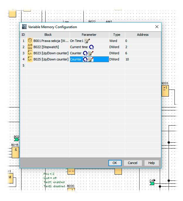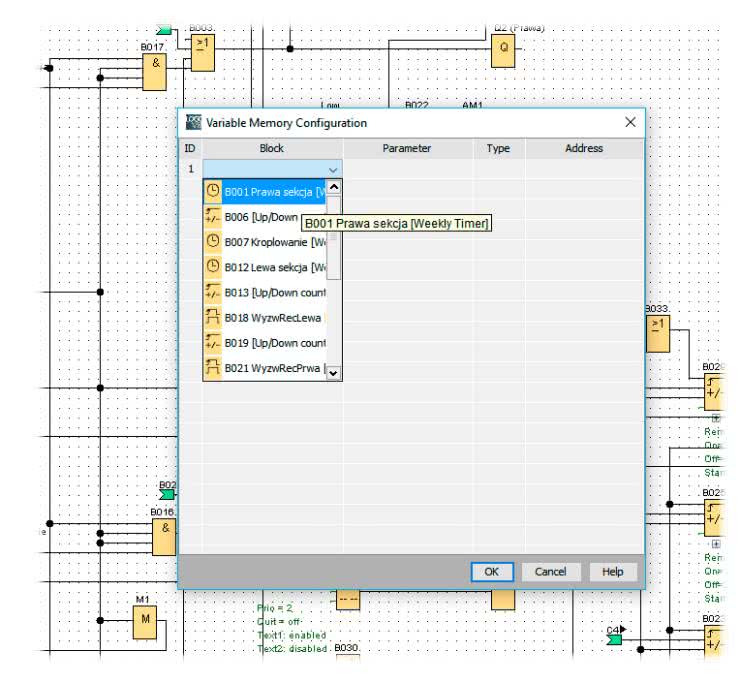 W zależności od wybranej zmiennej jej długość może mieć długość słowa lub podwójnego słowa, co automatycznie ustala program i także automatycznie nadaje zmiennym odpowiednie adresy. Po ustaleniu tabeli zmiennych (rysunek 17) zapisujemy ją w pamięci sterownika, co odbywa się jednocześnie z aktualizacją oprogramowania.