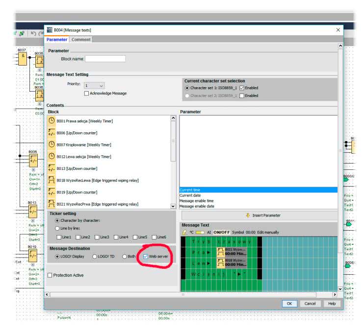 - Aby móc monitorować stan wyświetlacza LCD poprzez sieć musimy nieco zmodyfikować projekt implementowany w LOGO! Modyfikacja polega na zdefiniowaniu, które z komunikatów tekstowych wyświetlanych na wyświetlaczu LOGO! i/lub panela HMI będą dostępne za pośrednictwem sieci. Wymaga to uruchomienia okna edycyjnego komunikatu tekstowego (rysunek 7) i zaznaczeniu w nim opcji Webserver w sekcji Message Destination. Wszystkie komunikaty, które mają być widoczne poprzez sieć muszą mieć tę opcję zaznaczoną!