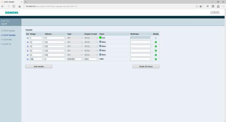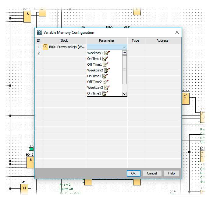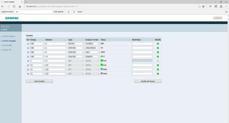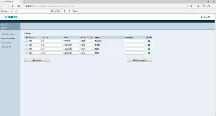 Wybór zmiennych podglądanych za pomocą serwera http w trybie LOGO! BM jest prosty jeżeli monitorujemy wejścia i wyjścia. Nieco bardziej skomplikowane jest podglądanie wartości zmiennych wybranych timerów, przetwornika A/C lub innych bloków funkcjonalnych. Niestety nie jest możliwe wybranie monitorowanych parametrów poprzez podanie nazwy własnej bloku funkcjonalnego (np. TimerTygodniowyStronyLewej), do tego celu trzeba skorzystać z pośrednictwa zestawu rejestrów VM (Variable Memory). Umożliwiają one wygodne i przy tym elastyczne udostępnianie wybranych zmiennych, niezależnie od ich bajtowej długości.