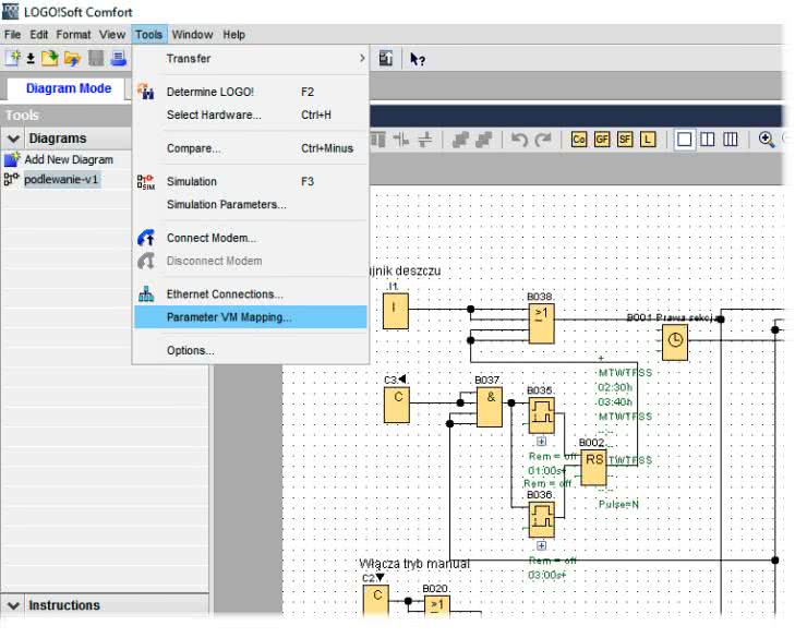 Udostępnienie wybranych zmiennych serwerowi HTTP wymaga zdefiniowania ich w programie LOGO! Soft Comfort, do czego służy opcja Tools>Parameter VM Mapping (rysunek 14). W wyświetlonym oknie ustalamy listę zmiennych do monitorowania, korzystając - co ważne – z nazw własnych nadanych blokom podczas edycji programu (rysunek 15).