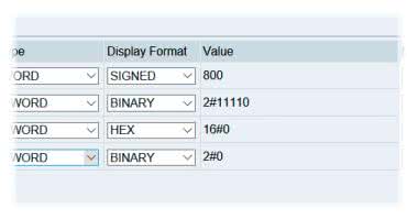 W kolejnym kroku definiujemy tabelę obserwowanych zmiennych w serwerze HTTP, co wymaga podania ich typów (w przykładzie pokazanym na rysunku 18 monitorujemy wyłącznie zmienne udostępnione w obszarze VM), adresu (zgodnie z wartościami w tabeli Parameter VM Mapping), typu zmiennej (także zgodnie z wartościami w tabeli) oraz oczekiwanego formatu wyświetlania (liczba ze znakiem, bez znaku, binarna lub szesnastkowa – rysunek 19). Opcjonalnie bieżące wartości zmiennych można modyfikować korzystając z dwóch prawych kolumn tabeli wyświetlanej przez serwer HTTP.