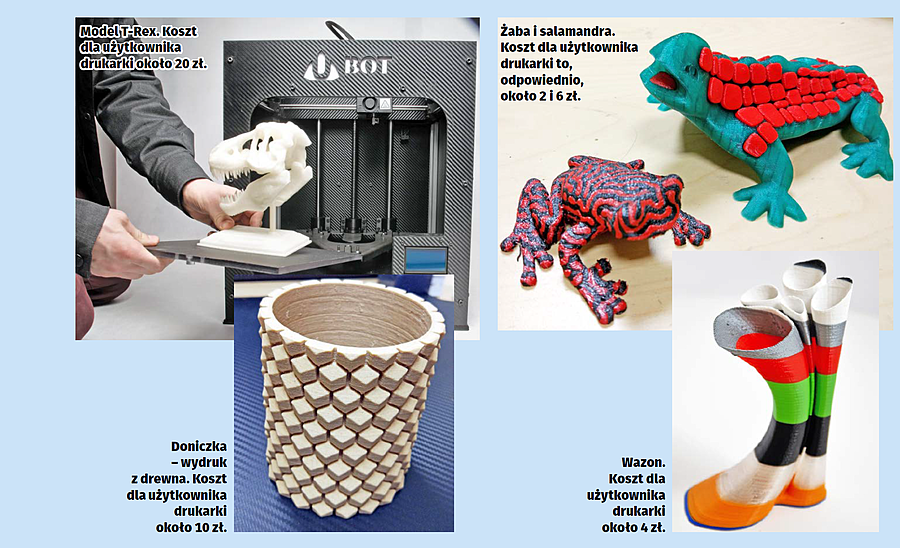 Kolejne pytanie, które pewnie nurtuje czytelników, to koszty samych wydruków lub urządzeń. Jeśli chodzi o wydruki, można rozgraniczyć tu dwa działania: ich powierzenie firmie zewnętrznej lub wydruk na własnych maszynach. Usługi wydruku (w technologii FDM) w profesjonalnych firmach wahają się od 15 do 100 zł netto za godzinę wydruku. Jak wspominałem, druk 3D jest technologią czasochłonną, więc koszt zlecenia może opiewać na sporą kwotę. Koszt wydruku dla użytkownika zależy natomiast od zużycia materiału i znikomego poboru prądu.