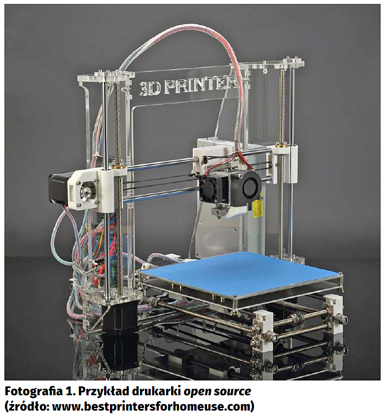 Po pierwsze, drukarkę 3D można kupić gotową (zmontowaną) lub w zestawie do samodzielnego montażu (DIY). Drukarki DIY, czyli kity do samodzielnego montażu, są najtańsze – taki zestaw można nabyć w cenie około tysiąca złotych, a niekiedy nawet taniej. Nie da się ich jednak porównać z profesjonalnymi maszynami oferowanymi przez producentów. Są to drukarki stricte dla hobbystów. Jeśli ktoś lubi majsterkować i ma sporo czasu, może wybrać tego typu urządzenie do zastosowań amatorskich. Budowa takiej drukarki będzie na pewno ciekawym wyzwaniem, więc warto uzbroić się w dużą dozę cierpliwości i czasu. Drukarki tego typu to pełny open source, dozwolone (a nawet wskazane) jest ich modyfikowanie i ulepszanie. W tym może pomóc np. społeczność RepRap. Najpopularniejszym i najczęściej modyfikowanym zestawem jest na pewno Prusa i3. Znane są również modele i2 oraz Mendel. Przykładową drukarkę open source pokazano na fotografii 1.