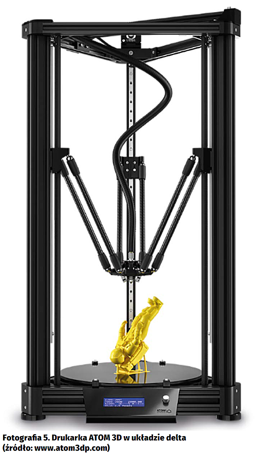 W drukarkach 3D układ delta ma więcej wad niż zalet. Zazwyczaj delty są konstrukcjami otwartymi. Jakość druku i szybkość też ustępuje większości standardowych drukarek w układzie kartezjańskim. Okrągły stół przy większości wydruków również powoduje utratę pola roboczego. Delty mają też problem ze sztywnością konstrukcji. Jedynym plusem, jaki przemawia za tym układem, jest to, że drukarka może tworzyć wysokie wydruki. Podstawa delty jest zazwyczaj mniejsza niż typowych drukarek – będzie więc zajmowała mniej miejsca na biurku. Przykładową drukarkę pracującą w układzie delty pokazano na fotografii 5.