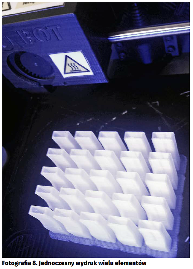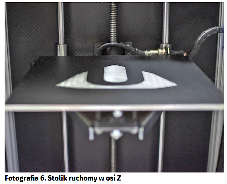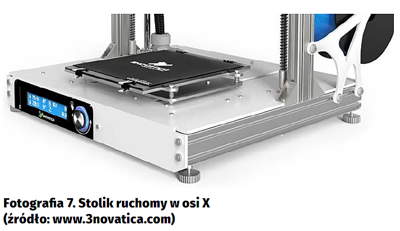 Stolik ruchomy w osi Z obniża się jedynie wraz z kolejną warstwą drukowanego modelu o dziesiąte lub setne części milimetra (w zależności od tego, w jakiej rozdzielczości drukujemy obiekt – fotografia 6). Natomiast stolik ruchomy w osi X lub Y porusza się z każdą ścieżką kładzioną przez dyszę drukarki (fotografia 7). Wykonuje wtedy o wiele więcej ruchów o wyższych prędkościach, co generuje spore siły bezwładności. Finalnie wpływa to na stosunek jakości do szybkości wydruku. Drukarki z ruchomym stolikiem w osiach X/Y, aby osiągnąć taką samą precyzję drukowanego obiektu, muszą pracować z mniejszymi prędkościami. Oczywiście, w drukarkach ze stolikiem pracującym w osi Z to karetka z hotendem porusza się w osiach X/Y i ona również generuje siłę inercyjną, jednak masa, która się porusza, jest znacznie mniejsza niż masa stolika i występujące siły są mniejsze. Lepszym wyborem wobec tego wydaje się drukarka w układzie kartezjańskim ze stolikiem poruszającym się w osi Z.
