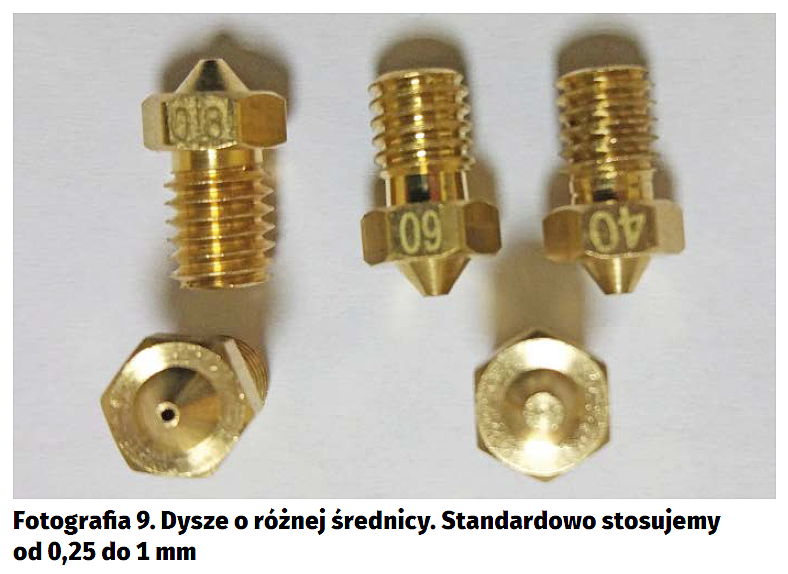 Trzeba pamiętać, że nie wszystkie elementy drukarki są objęte gwarancją. W większości urządzeń elementami eksploatacyjnymi są dysze, stoliki lub ich powierzchnie, a czasem nawet i całe elementy grzewcze. O ile wymiana dyszy w niektórych urządzeniach to koszt kilkunastu – kilkudziesięciu złotych, to niektóre wymagają wymiany całego bloku albo głowicy. Wtedy koszt sięga setek złotych, a dysza to element, który niestety może dość łatwo ulec zatkaniu. Dyszę wymieniamy nie tylko wtedy, gdy się zatka – warto zaopatrzyć się w dysze o różnej średnicy (fotografia 9). Mniejsze do bardzo precyzyjnych wydruków i większe do zgrubnych. Stosując większą dyszę, jak łatwo się domyślić, możemy znacznie skrócić czas wydruku.