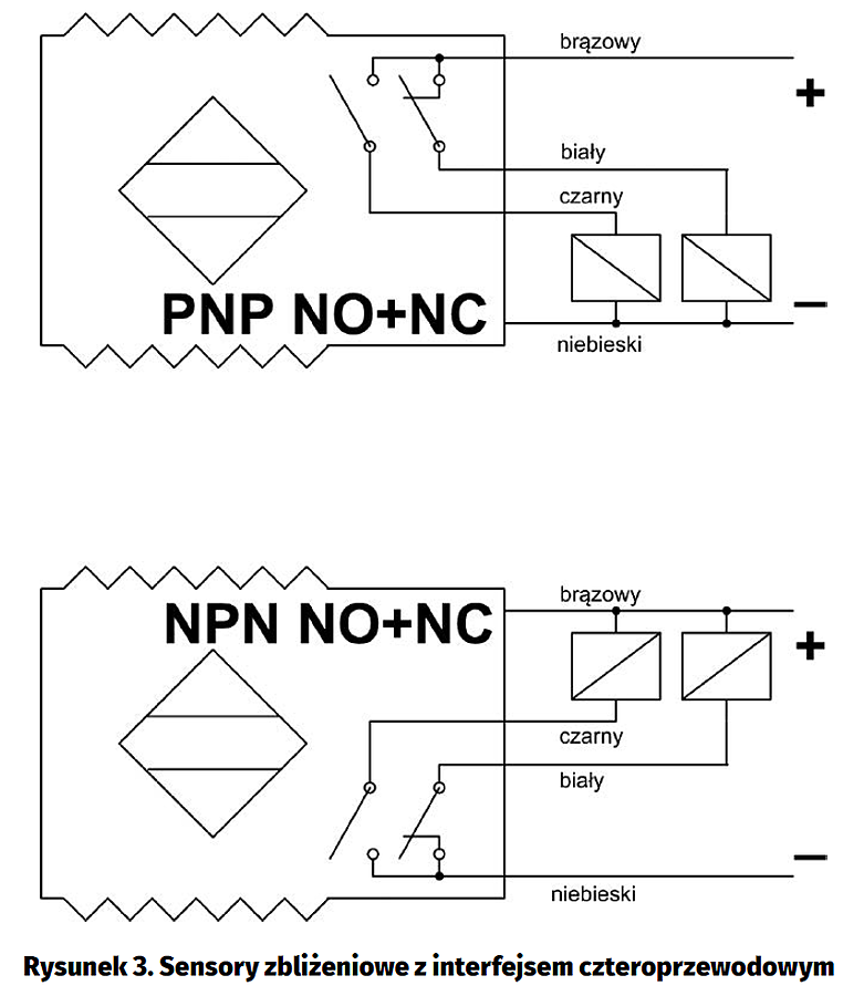 Na rysunku 2 przedstawiono obecnie najczęściej spotykany interfejs trójprzewodowy. Nieco rzadziej spotykana jest jego odmiana czteroprzewodowa, przedstawiona na rysunku 3. Sensory wyposażone w interfejs trójprzewodowy posiadają wzmacniacz wyjściowy NO lub NC sterujący dołączonym obciążeniem. Sensory z interfejsem czteroprzewodowym posiadają komplementarne wyjścia (NO + NC). Oba rodzaje czujników są wyposażone w wyjścia typu PNP lub NPN standardowo zabezpieczone przed zwarciem oraz przepięciami generowanymi przez obciążenia indukcyjne. Niektóre z sensorów są zabezpieczone przed odwrotnym podłączeniem napięcia zasilania.