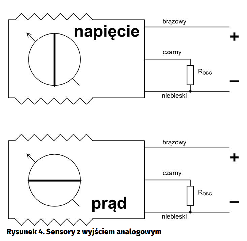 Sensory wyposażone w interfejs analogowy są odmianą sensorów z interfejsem trójprzewodowym z tym, że prąd lub napięcie wyjściowe są proporcjonalne do odległości pomiędzy sensorem a obiektem. Sposób połączenia pokazano na rysunku 4. Tego typu urządzenia mogą służyć nie tylko jako czujniki obecności, ale również jako dalmierze. Stosowanie ich jako czujników obecności wymaga zastosowania zewnętrznych układów komparatorów napięcia lub prądu, co nie w każdej sytuacji się opłaca. Dlatego też najczęściej używane są one jako uniwersalne, pełniące różne funkcje w połączeniu ze sterownikiem PLC i odpowiednim oprogramowaniem.